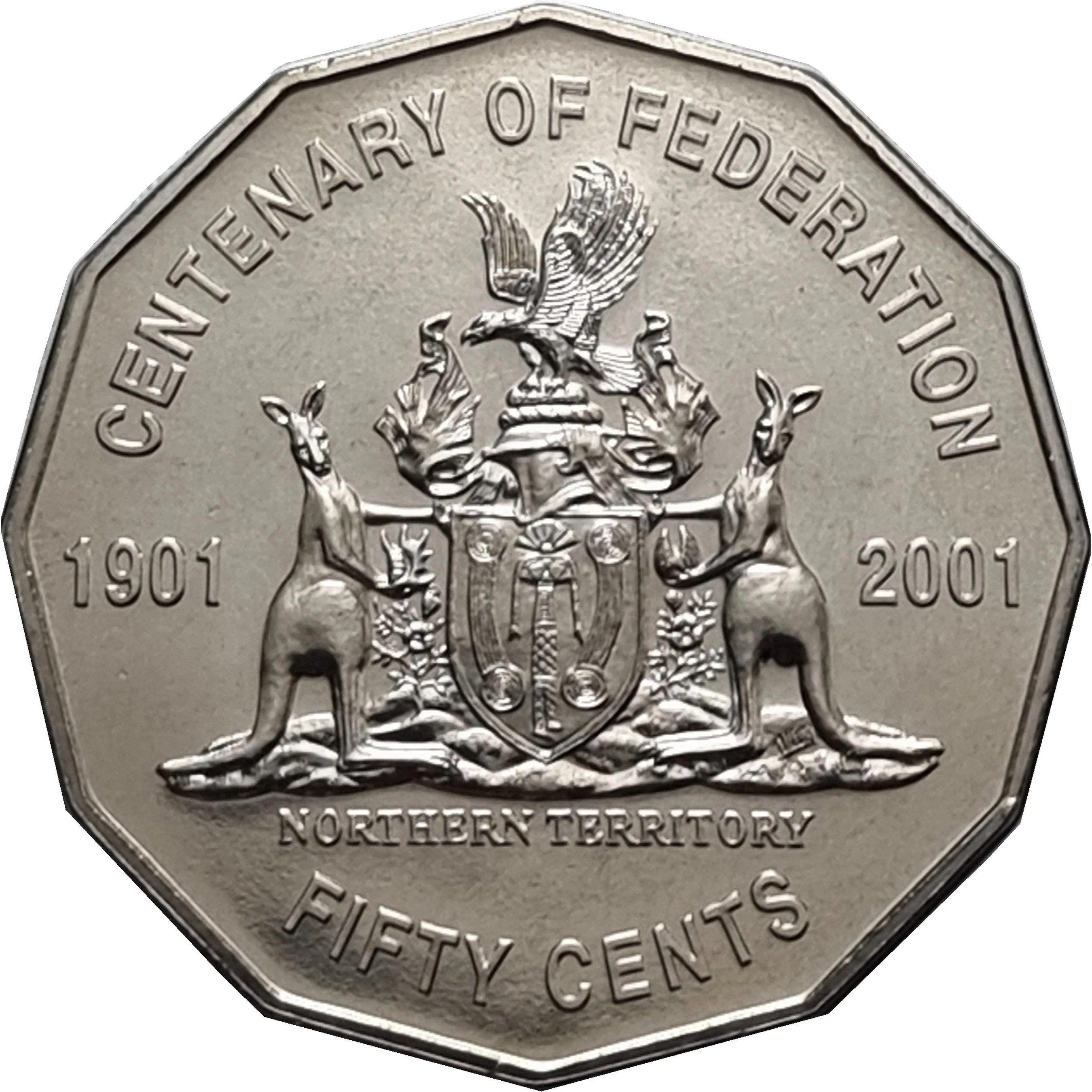 The Northern Territory coat of arms features a shield with the figure Tenny, supported by red kangaroos. It includes Sturt's Desert Rose below and a Wedge-tailed Eagle with a Tjurunga stone above. It represents one of Australia's nine states and territories.