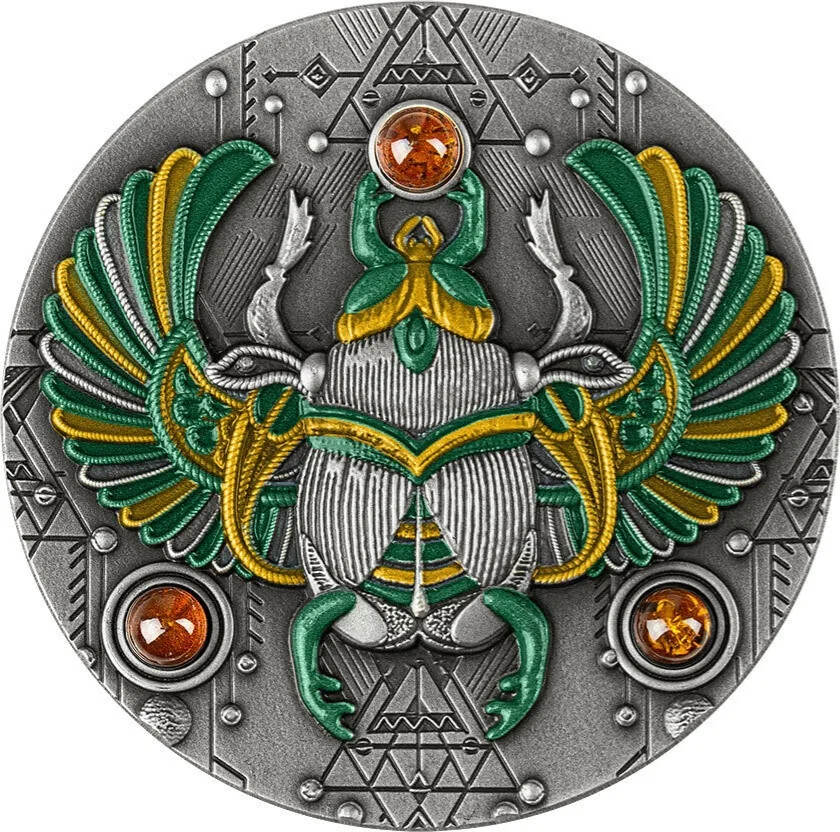 Scarab with open wings and amber inserts.