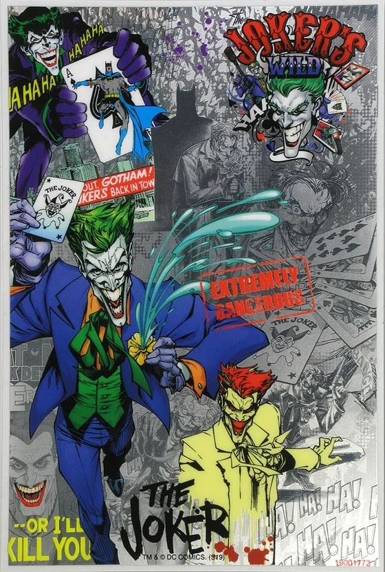 Description: A montage celebrating The Joker's chaos, blending engraving and colorized printing to animate the character.