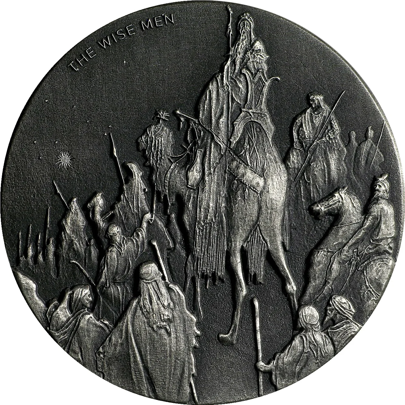 The wise men, guided by a bright star, journey to Bethlehem watched by onlookers.