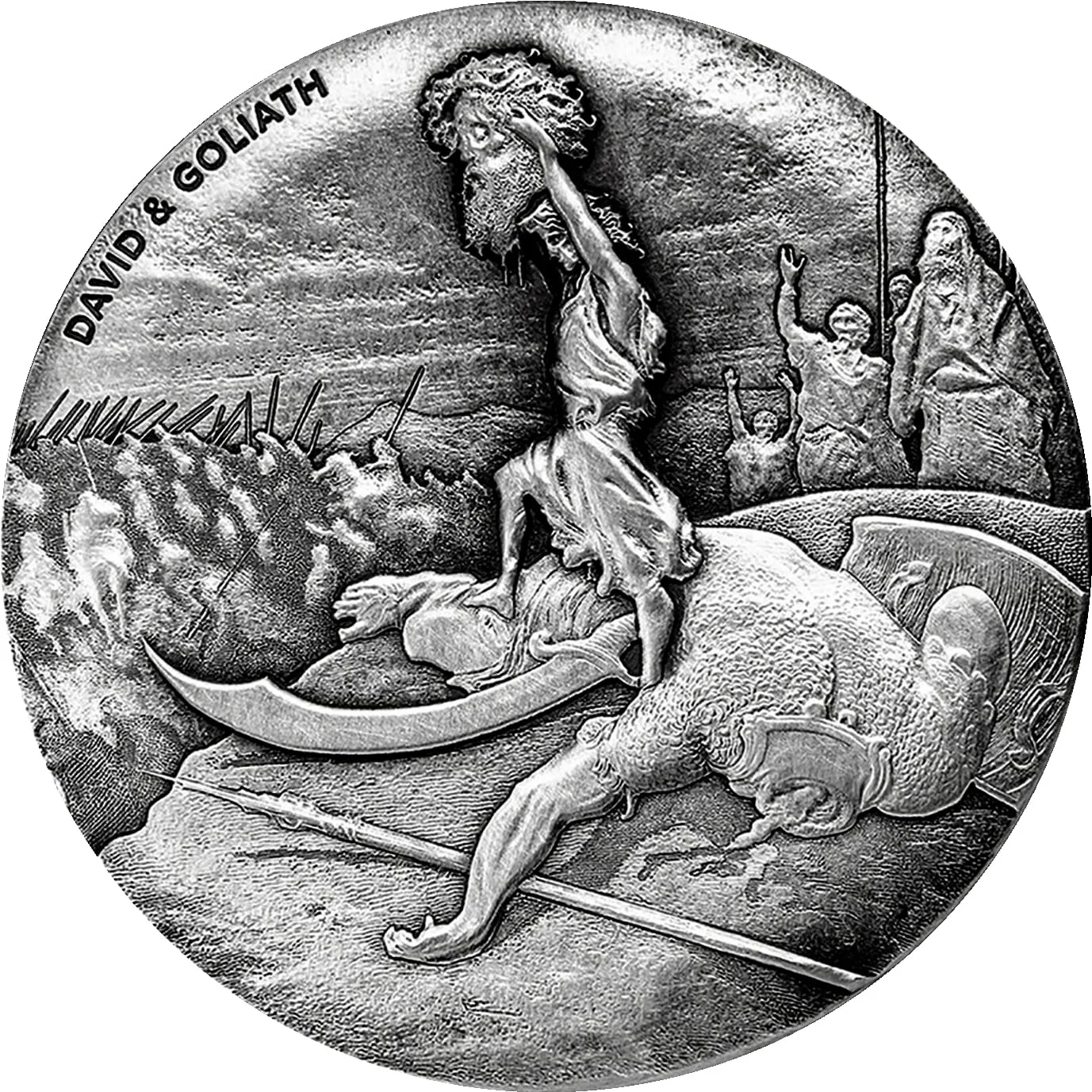 Inspired by Gustave Doré's "David & Goliath," depicting David presenting Goliath's head to his triumphant army.