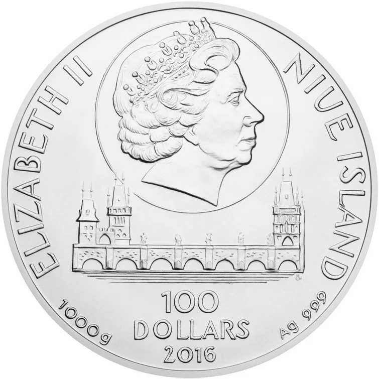 Queen Elizabeth II's effigy with the Charles Bridge and its towers.