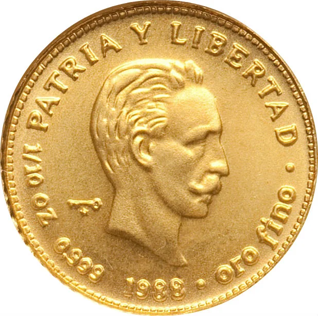 Portrait of José Martí right, motto above, mintmark left, date below, weight and fineness on sides.