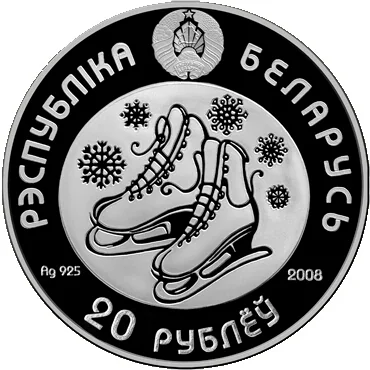 Description: Obverse: The State Coat of Arms. Reverse: Figure skates within an oval of snowflakes; the year, alloy standard, and circumferential inscriptions: "РЭСПУБЛІКА БЕЛАРУСЬ" and "20 РУБЛЁЎ".