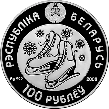 Description: Obverse: The State Coat of Arms. Reverse: Figure skates within an oval of snowflakes, the year, and alloy standard. Circumscription: "РЭСПУБЛІКА БЕЛАРУСЬ" above, "100 РУБЛЁЎ" below.