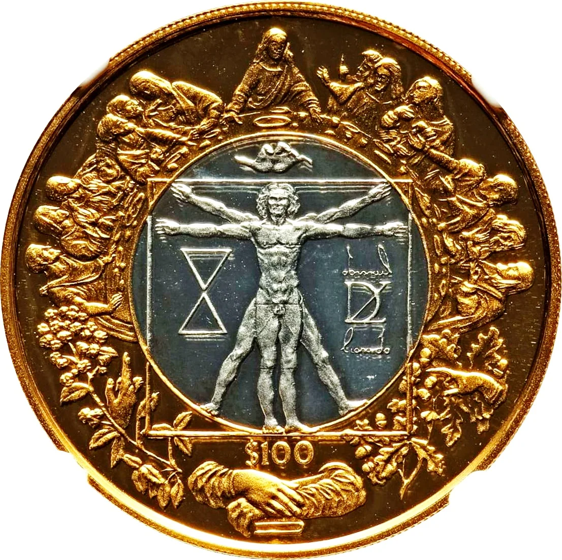 The Vitruvian Man by Leonardo da Vinci is central, with his signature to the right. The outer ring depicts Jesus and the Twelve Apostles at the Last Supper.