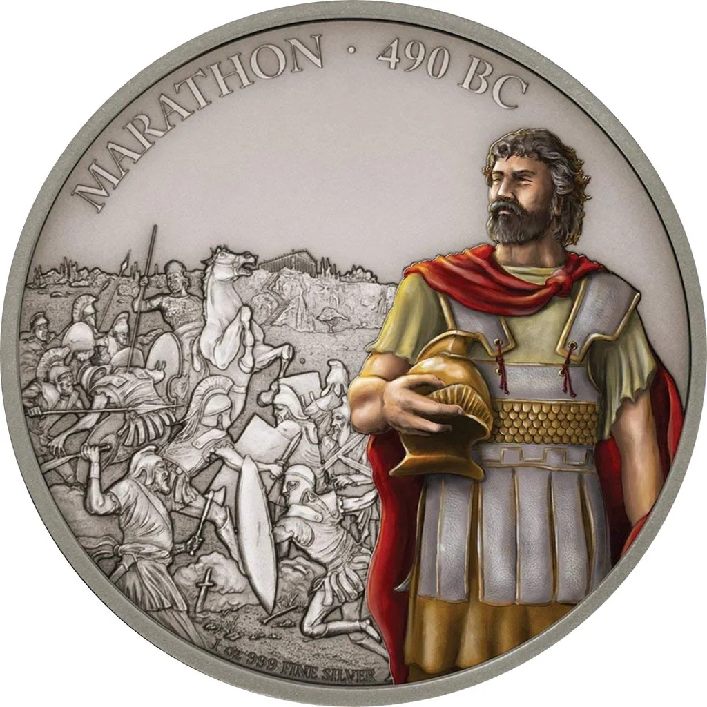 Athenian General Miltiades before an engraved backdrop of Greek and Persian combat.
