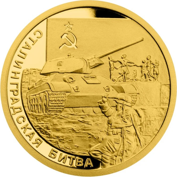A German soldier attacks a T-34/76 tank with a grenade. Nearby, the Soviet flag flies and the undamaged "Children's Circle Dance" fountain, featuring a crocodile, stands amidst the ruins of Stalingrad.