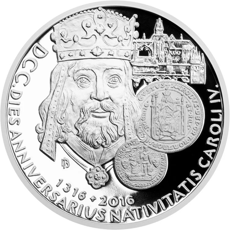 The reverse features Charles IV with Prague Castle, the Old Town, Charles Bridge, and seals of the University and the ruler.