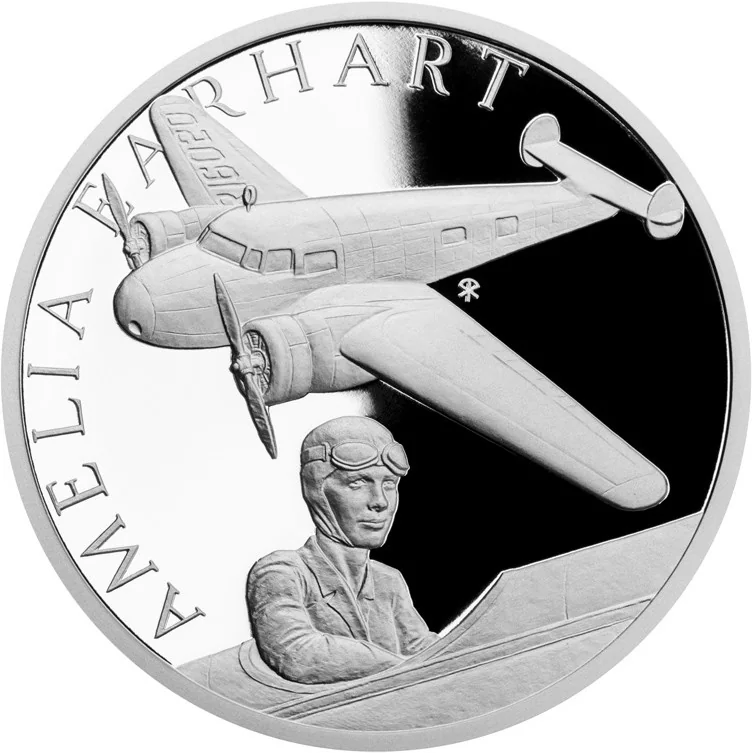 Amelia Earhart in an airplane cockpit, glasses on her head.