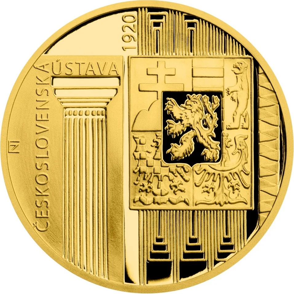 A Constitutional Court column bearing the Czechoslovak tricolor and large national emblem within an ornamental design.