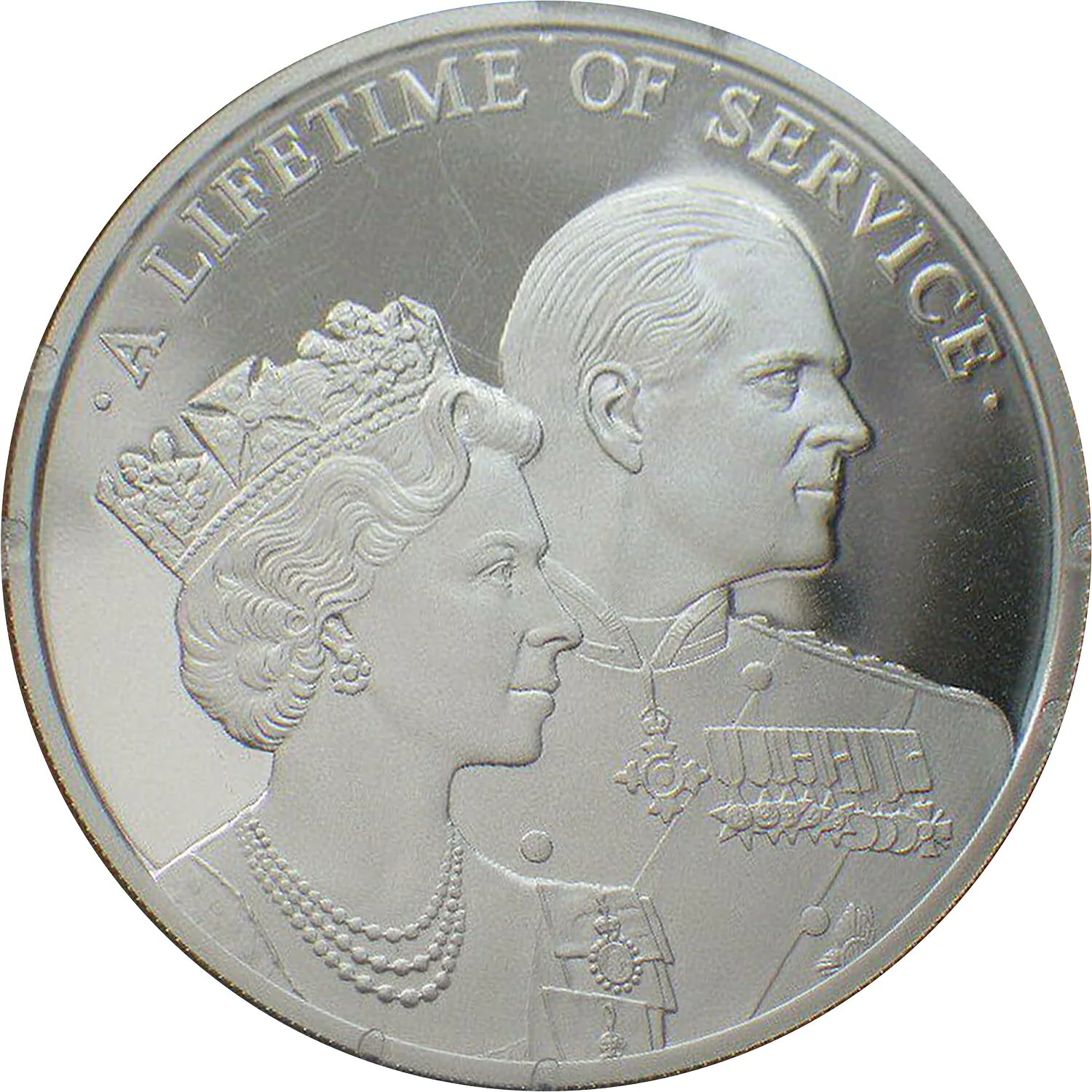 Queen Elizabeth II in crown and beaded necklace with Prince Philip in uniform and medals.
