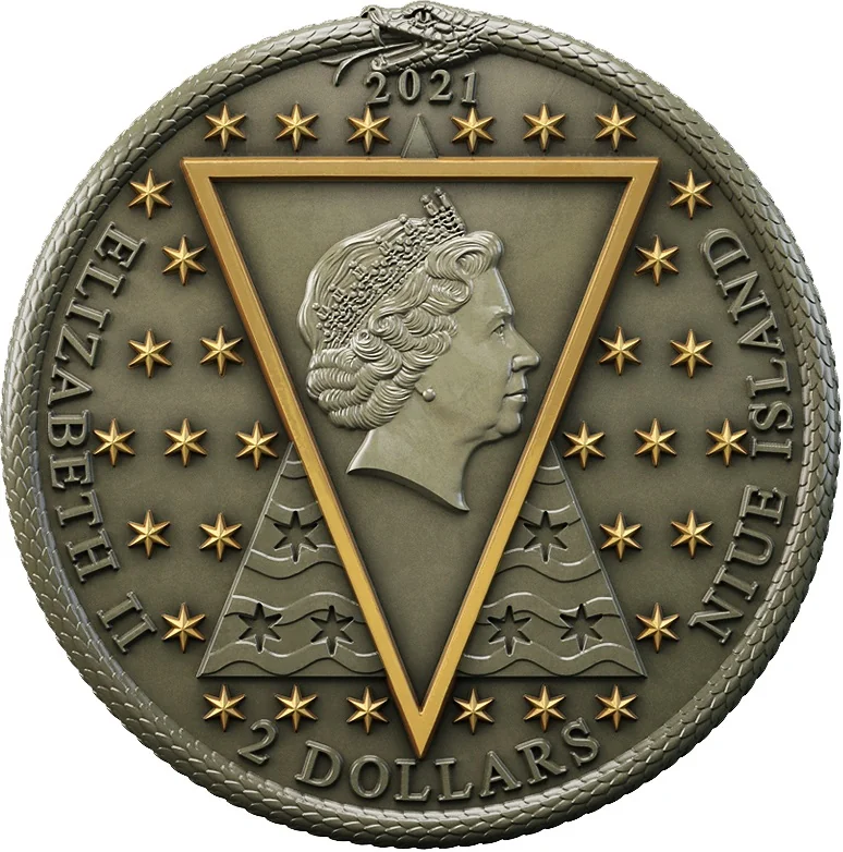 Queen Elizabeth II's effigy encircled by elemental symbols.