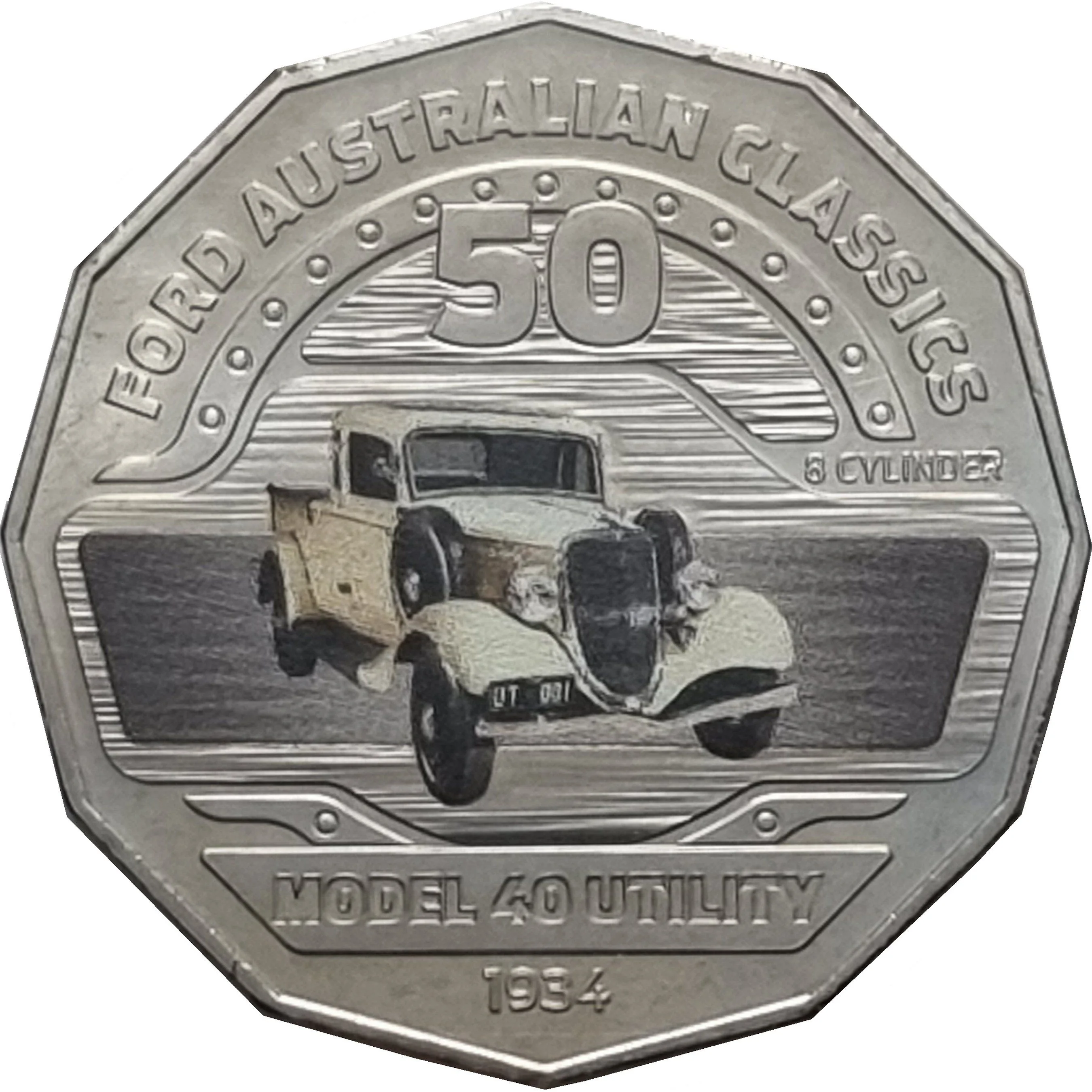 Australian-built 1934 Ford Model 40 Coupe Utility in cream, pad-printed on a medallion with a grey background.