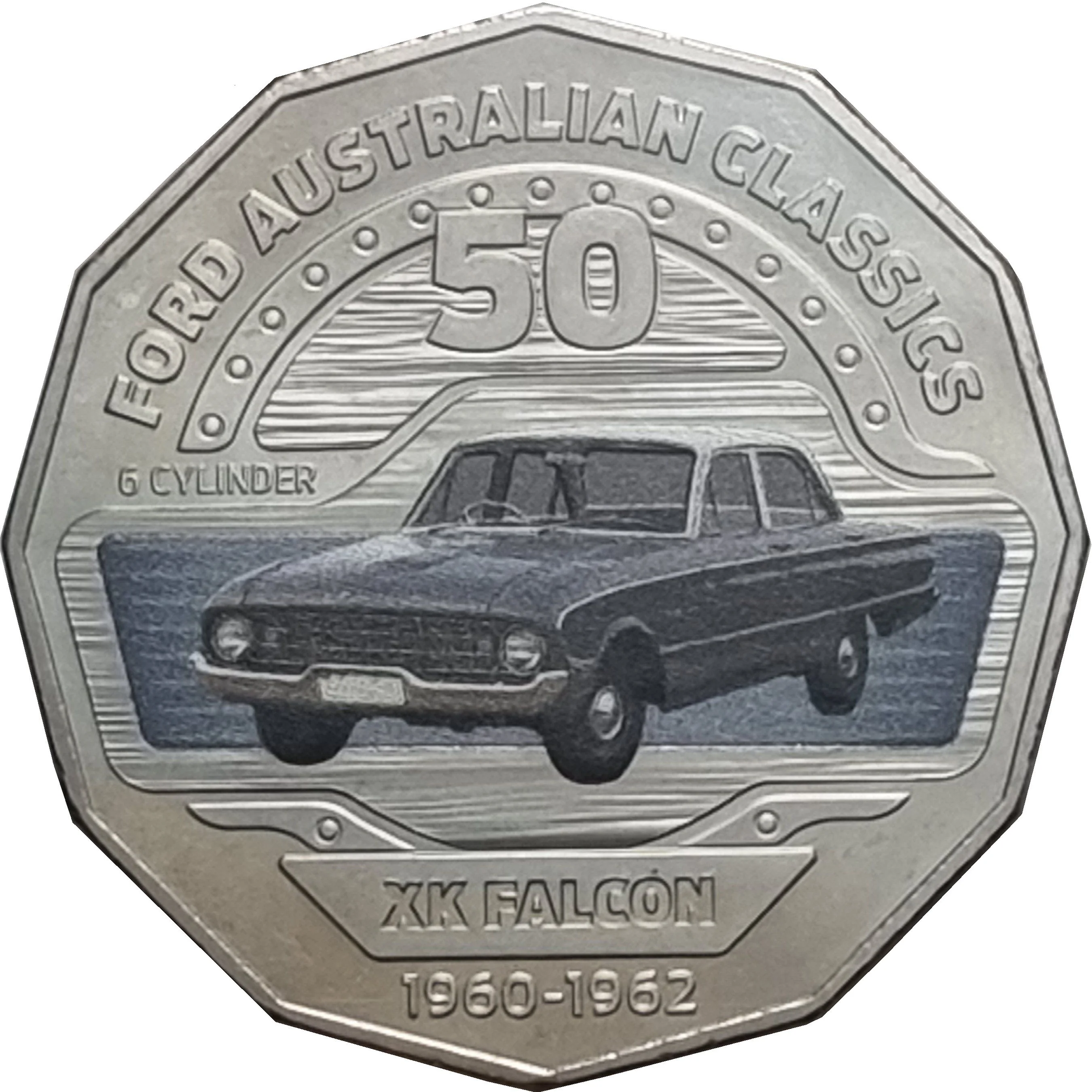 Australian-built 1960 grey XK Ford Falcon sedan on a light blue medallion background.
