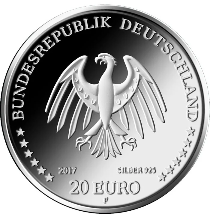 German federal eagle with "BUNDESREPUBLIK DEUTSCHLAND" above, and the year, mint letter, silver content, and year below.