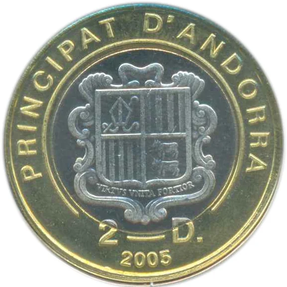 Andorran coat of arms featuring the motto "Virtus Unita Fortior" in a partial circle.