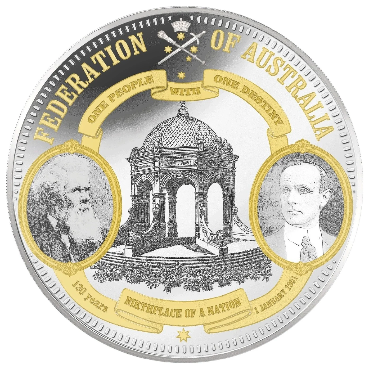 Portraits of Henry Parkes and John Hope, Australia's first Governor-General, with the Federation Pavilion.