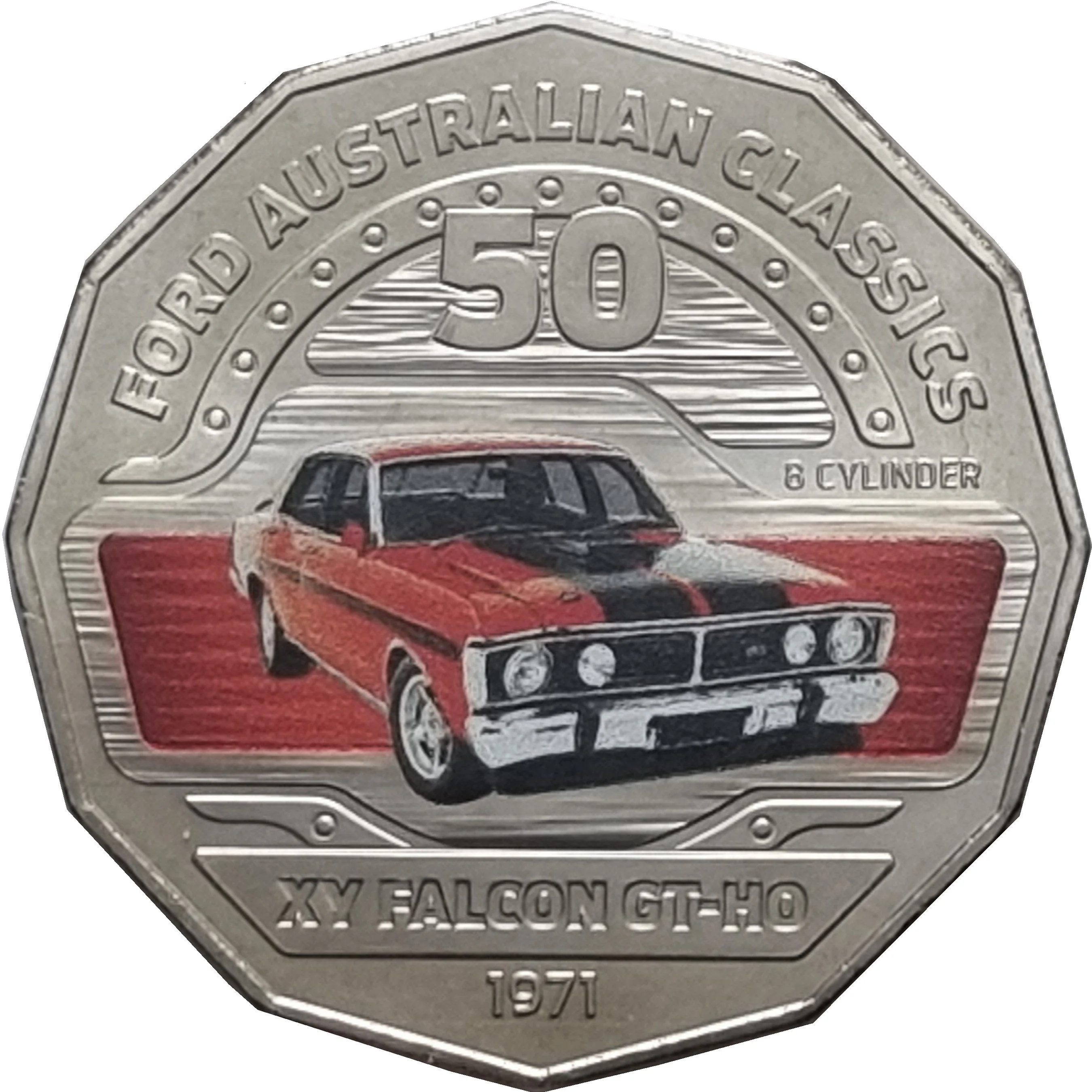 A 1971 Australian XY Ford Falcon GT-HO in red, pad-printed on a medallion-style background.