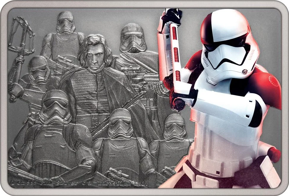 The Trooper poised to strike, with an engraved backdrop of Kylo Ren, Captain Phasma, and other battle-ready troopers.