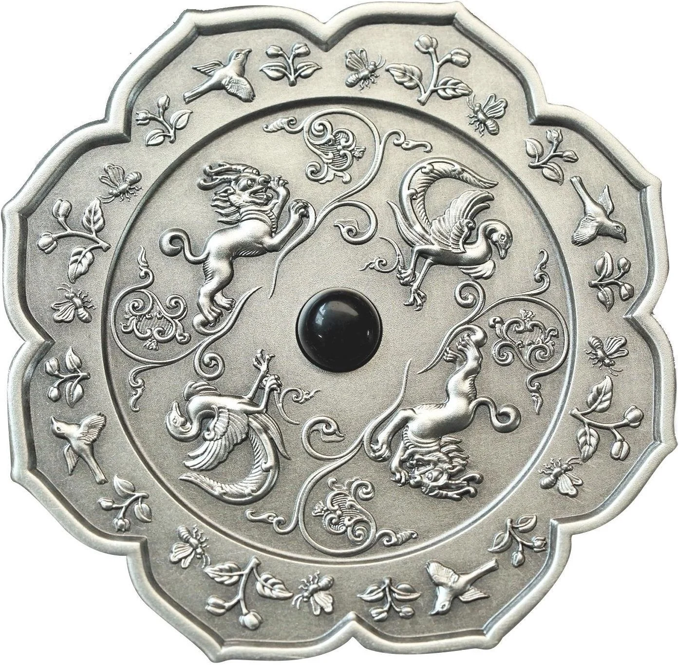 Antique bronze mirror with Chinese motifs, featuring an obsidian insert and encircled by dual phoenix and dragon designs.