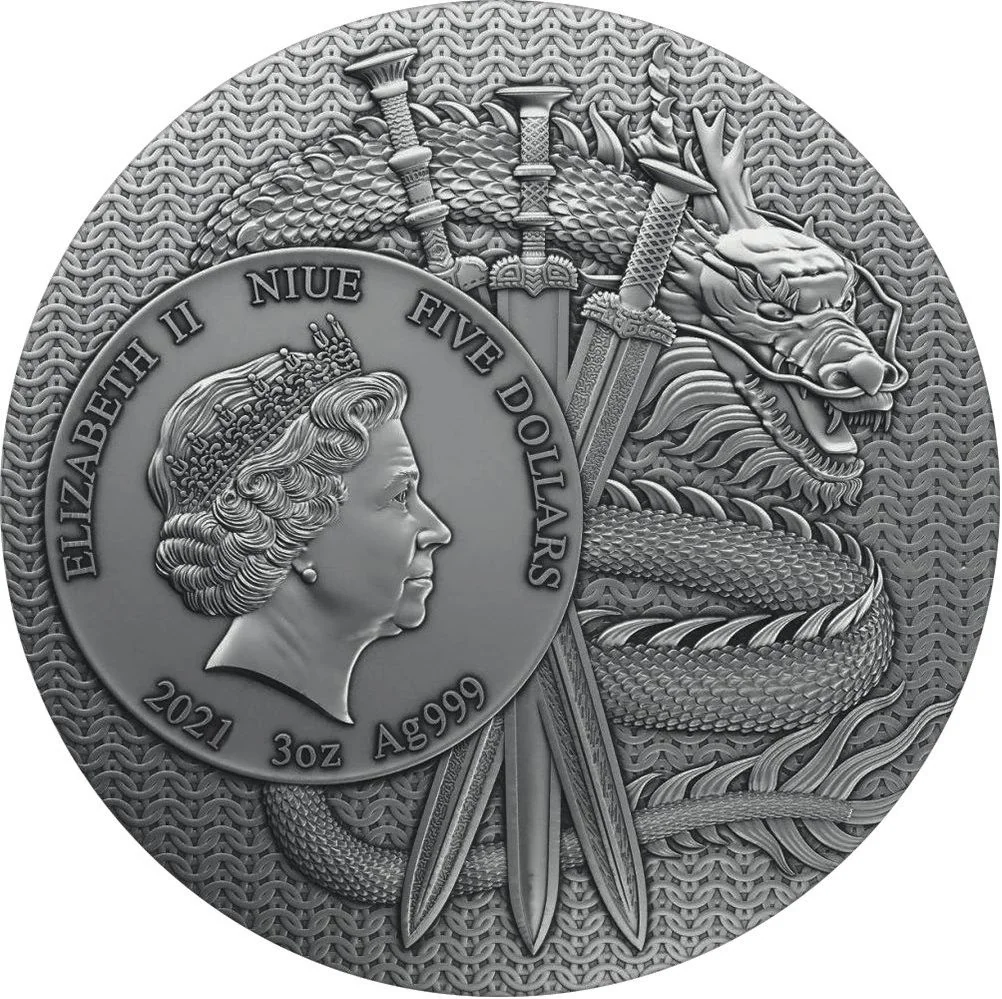 Queen Elizabeth II's effigy encircled by a dragon bearing three swords.