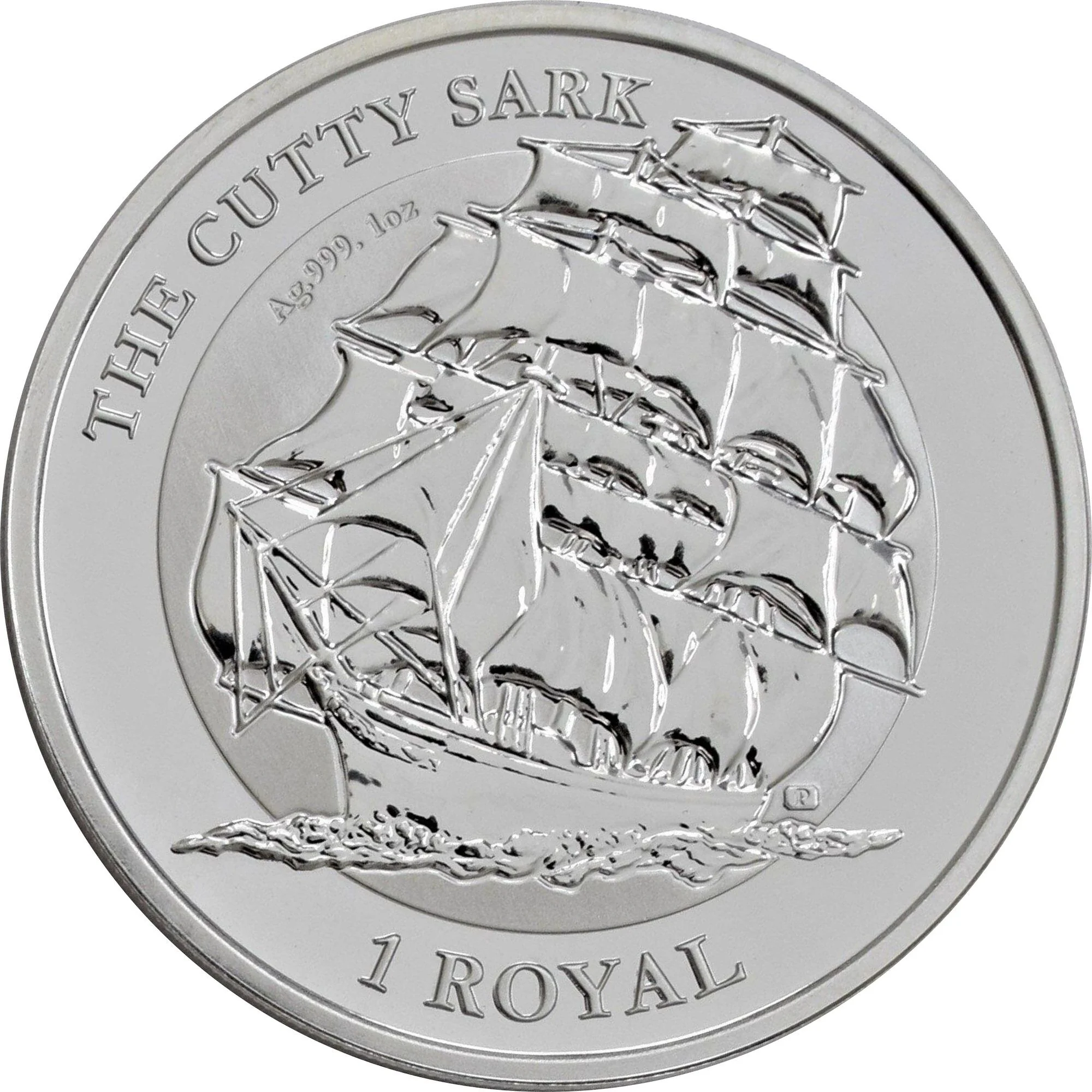 The Cutty Sark under full sail on frosted seas, with the Pobjoy mintmark astern and metal composition to the left. The mirrored border bears the design title, with the face value below.