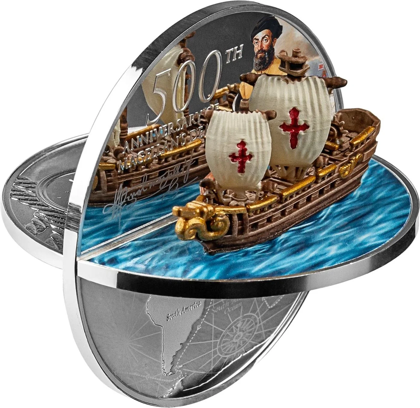 A 3D image of Ferdinand Magellan featuring his ship.