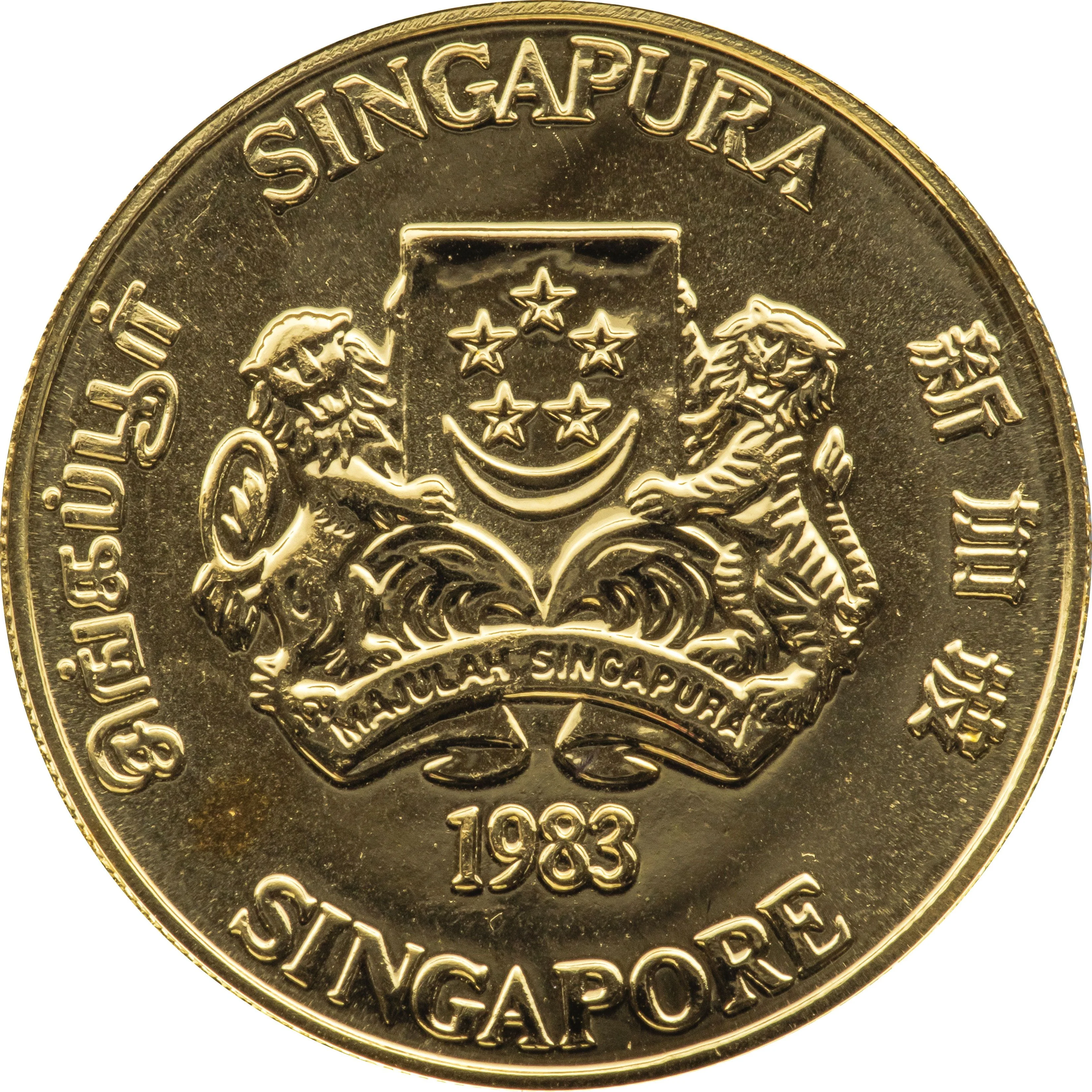 Emblem with date; 'Singapore' encircles it in English, Tamil, Chinese, and Malay.