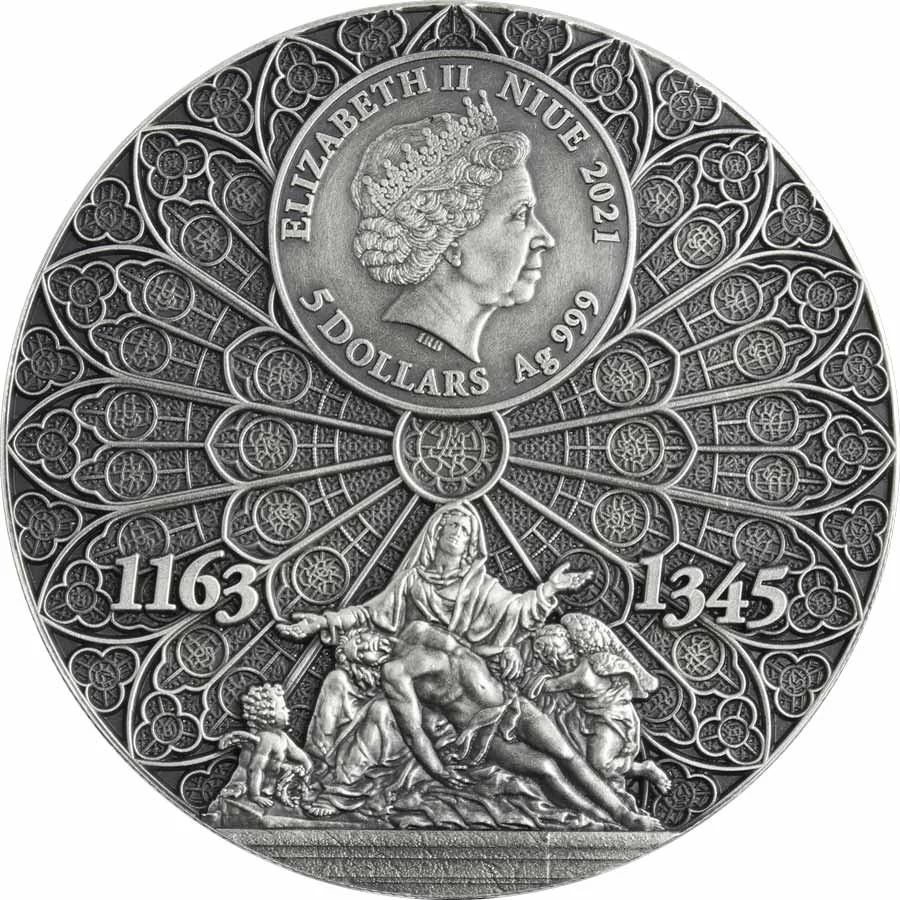 Notre Dame's north rose window featuring Queen Elizabeth II.