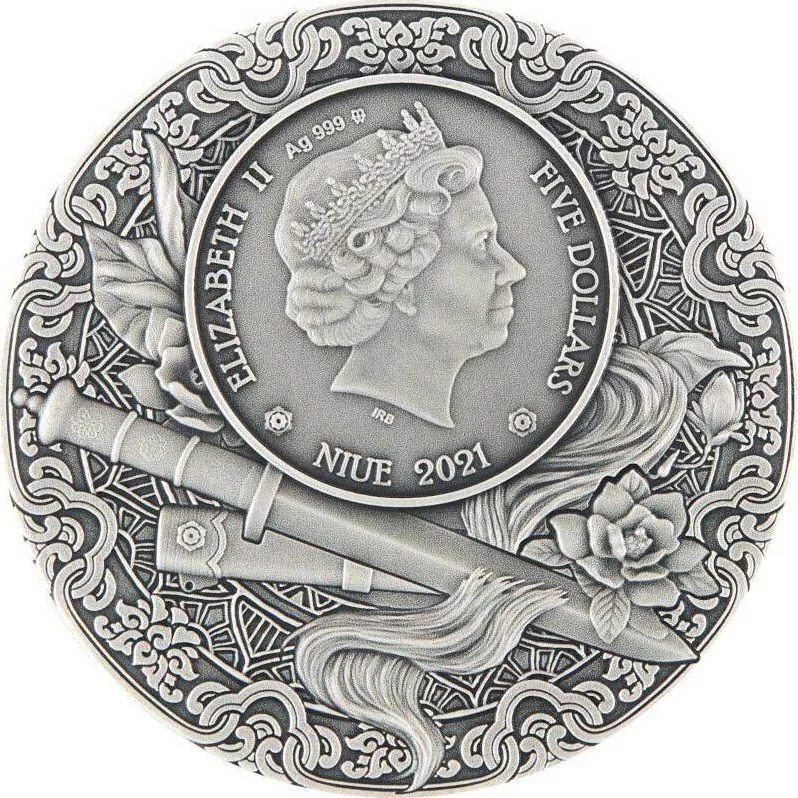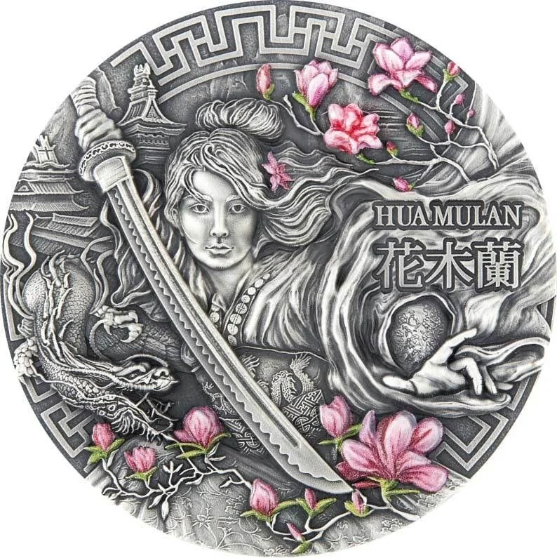 Queen Elizabeth II depicted with Mulan's sword and a magnolia.