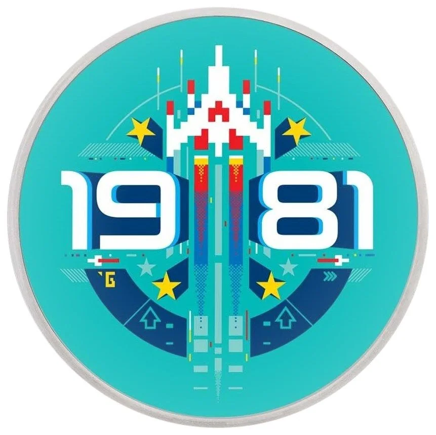 A licensed full-color pattern of the GALAGA™ Fighter firing missiles, its booster flames splitting "1981."