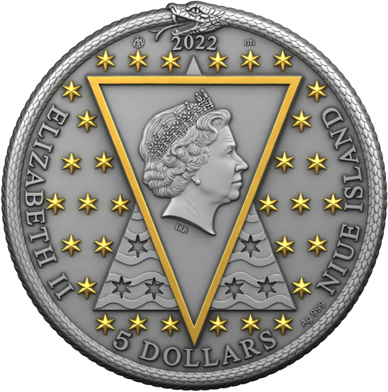 Queen Elizabeth II's effigy encircled by elemental symbols.