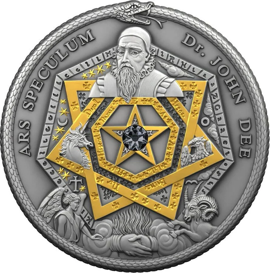Dr. John Dee, an alchemist famed for seeking angelic and cosmic communication, surrounded by symbols and mystical creatures representing his quest for knowledge.