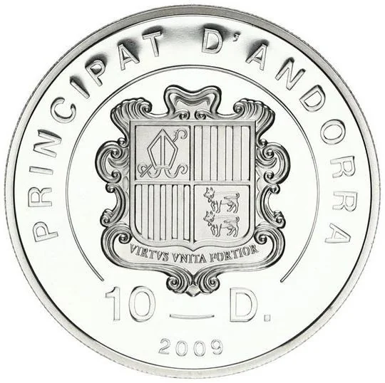 Andorran coat of arms featuring the motto "Virtus Unita Fortior" in a partial circle.