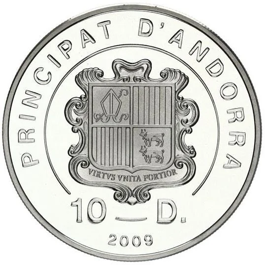 Andorran coat of arms featuring the motto "Virtus Unita Fortior" in a partial circle.