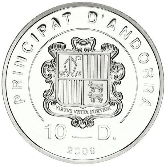 Andorran coat of arms featuring the motto "Virtus Unita Fortior" in a partial circle.