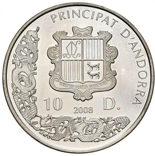 Andorra's coat of arms with the motto "Virtus Unita Fortior" and valances on the left and bottom.