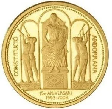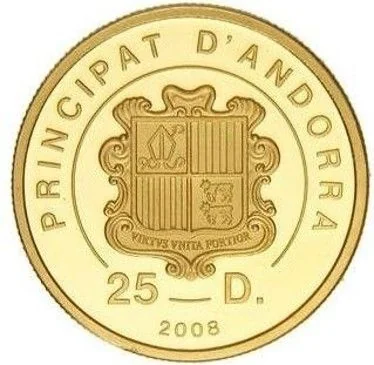 Andorran coat of arms featuring the motto "Virtus Unita Fortior" in a partial circle.