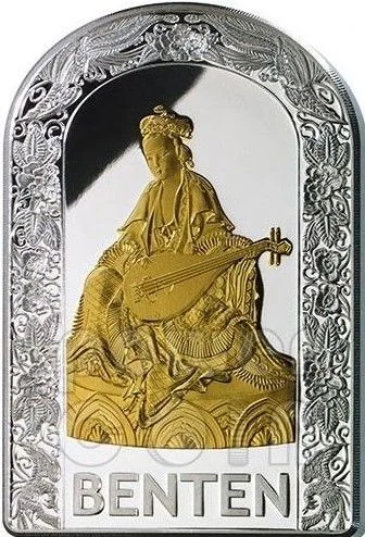 Gilt Japanese Buddhist goddess Benten holding an instrument.