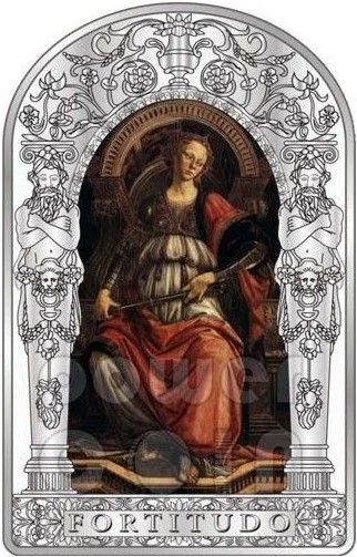 Andorran coat of arms on a capital, flanked by floral designs and painter's palettes.