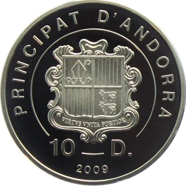 Andorran coat of arms featuring the motto "Virtus Unita Fortior" in a partial circle.