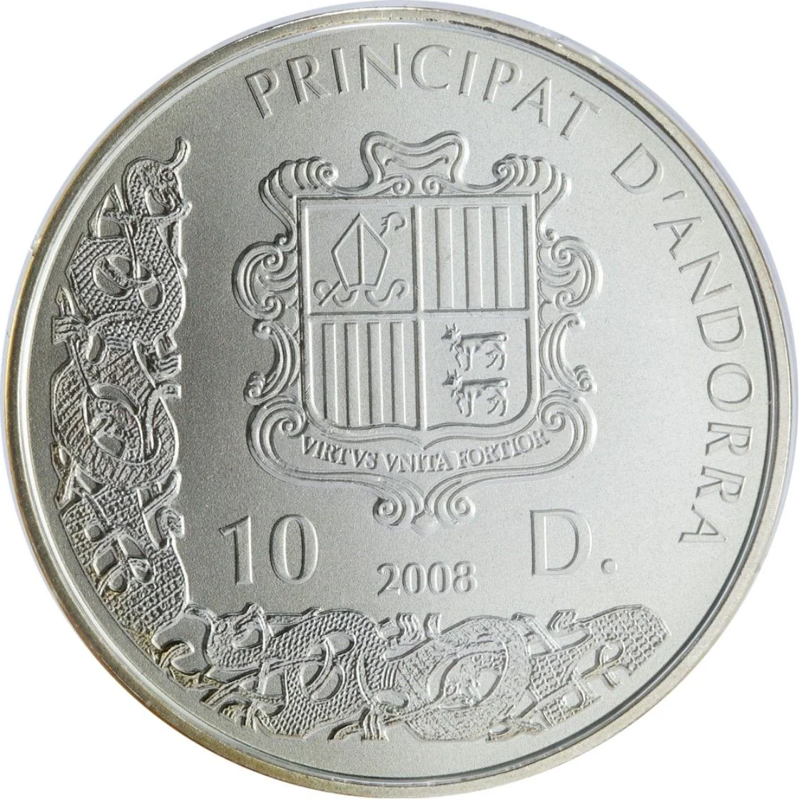 Andorra's coat of arms with the motto "Virtus Unita Fortior" and valances on the left and bottom.