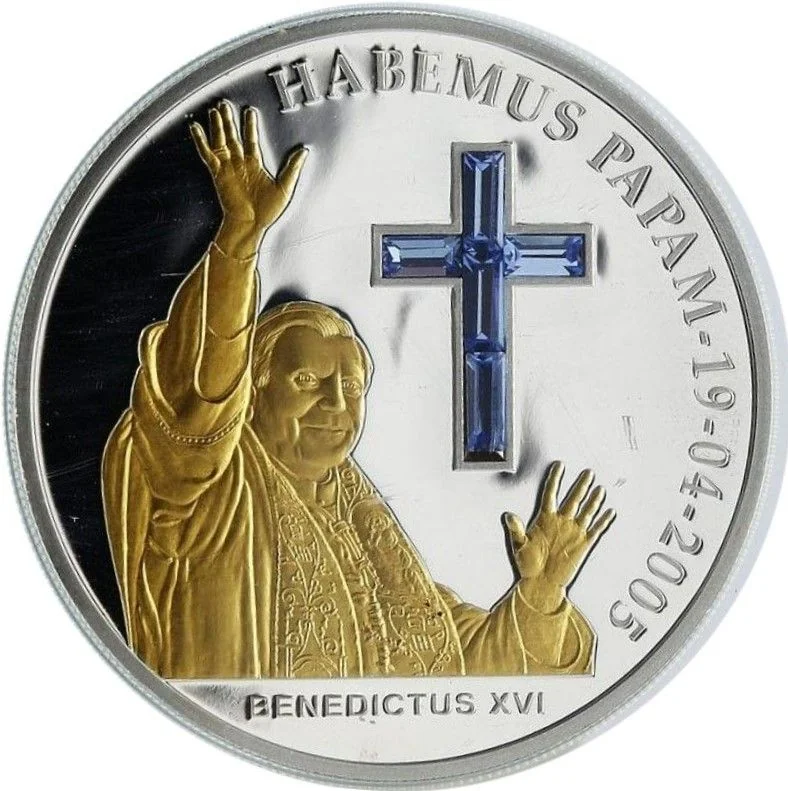 Benedict XVI, hands raised, with a gilt crystal cross.