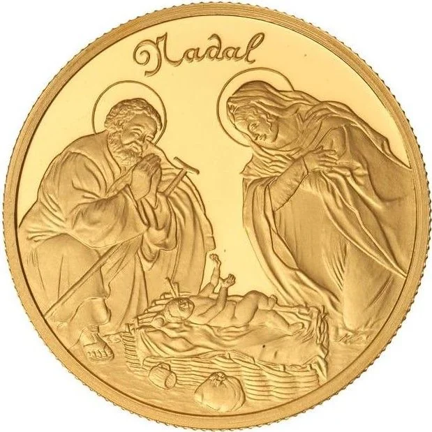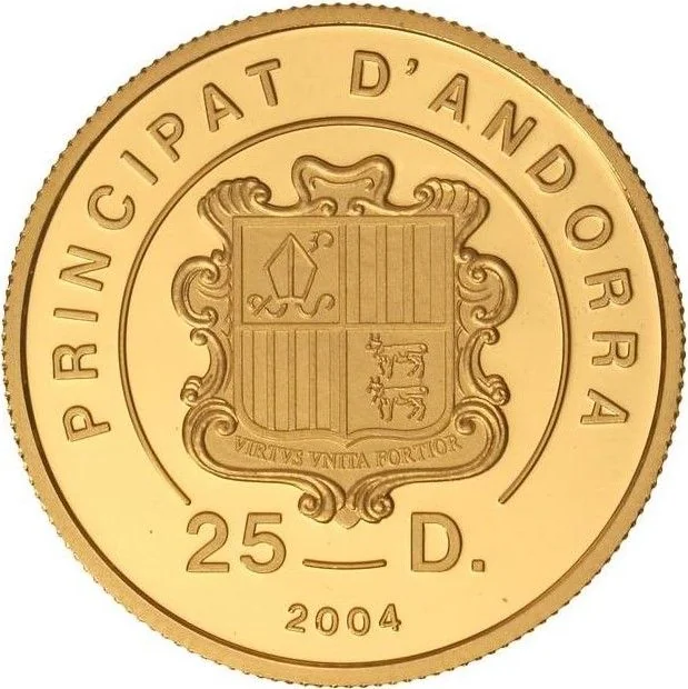 Andorran coat of arms featuring the motto "Virtus Unita Fortior" in a partial circle.