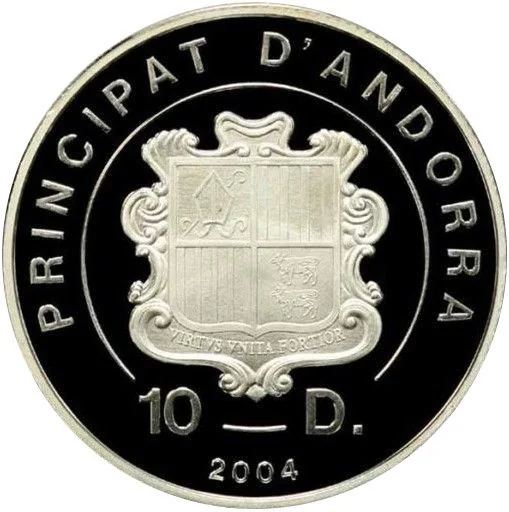 Andorran coat of arms featuring the motto "Virtus Unita Fortior" in a partial circle.