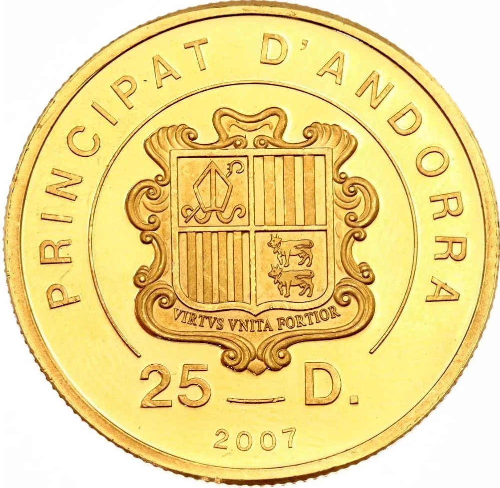 Andorran coat of arms featuring the motto "Virtus Unita Fortior" in a partial circle.