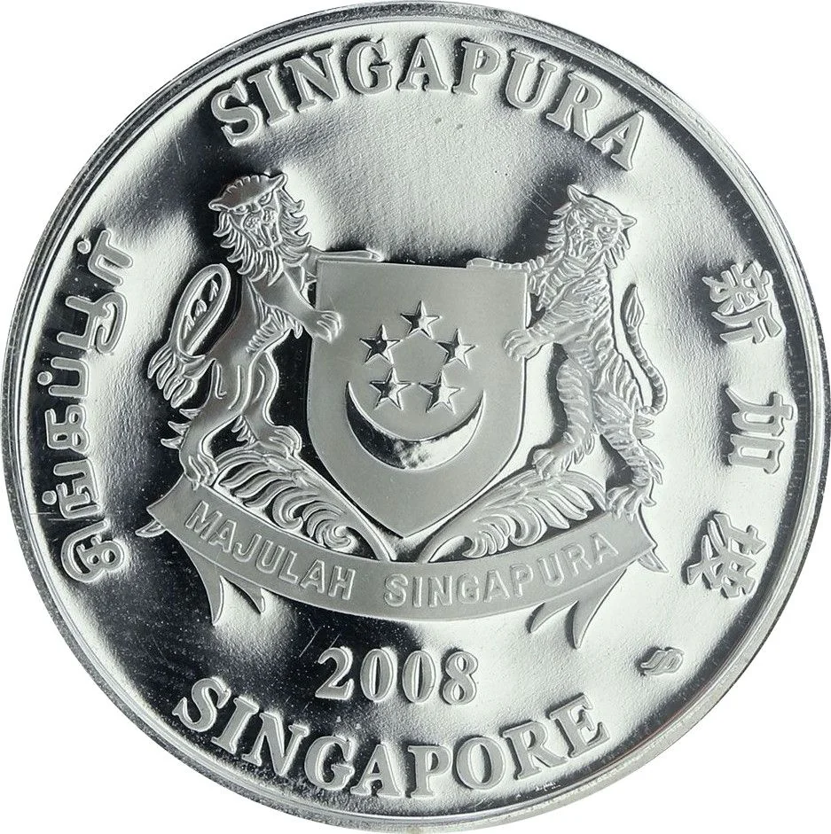 Emblem with date; 'Singapore' encircles it in English, Tamil, Chinese, and Malay.