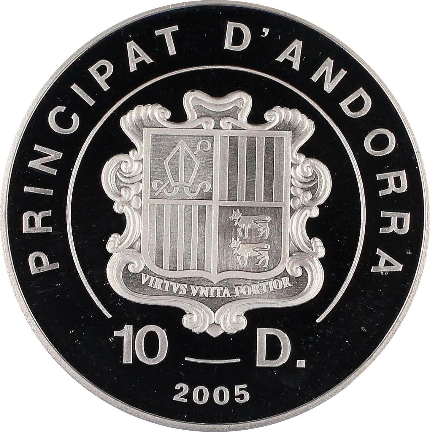 Andorran coat of arms featuring the motto "Virtus Unita Fortior" in a partial circle.