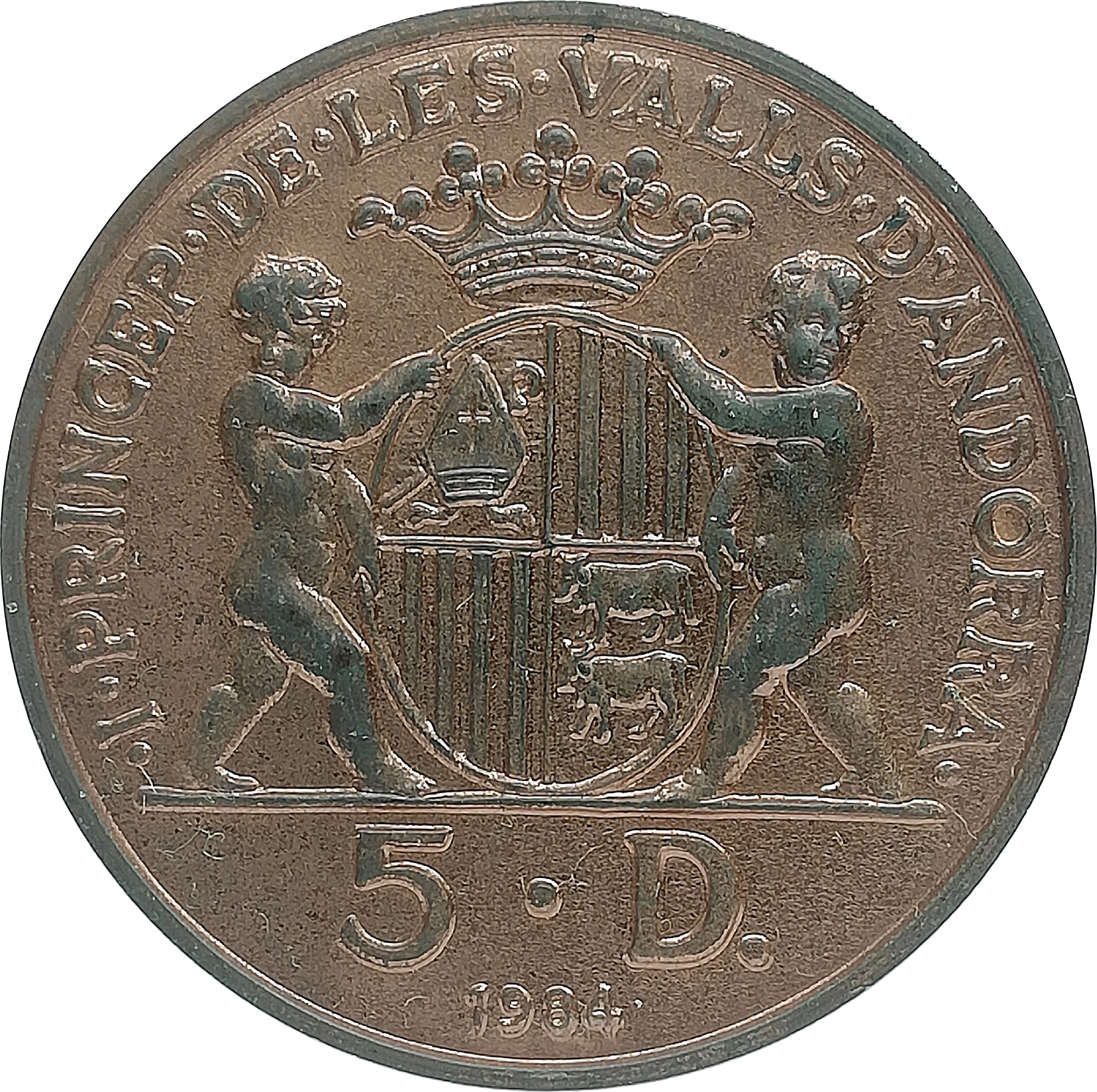 Andorran coat of arms held by cherubs, with value and date beneath.
